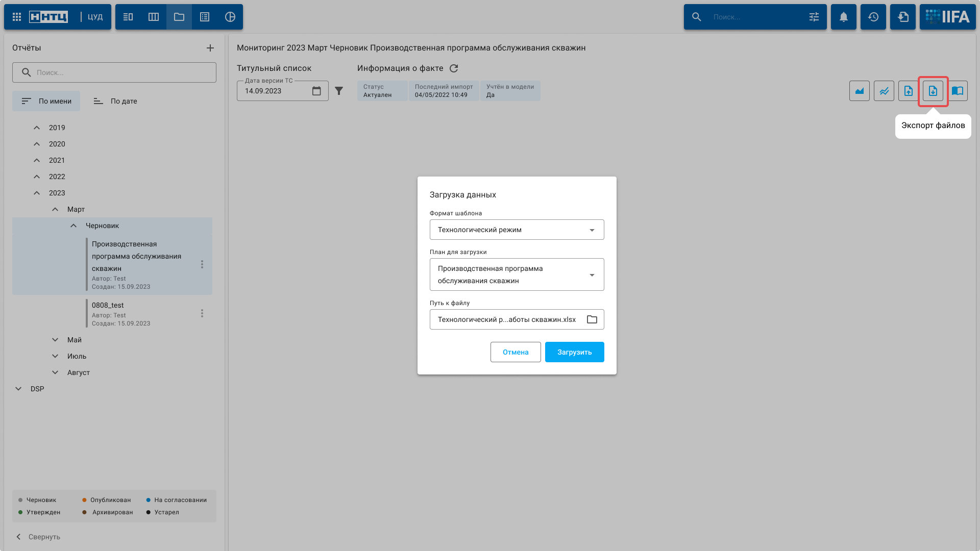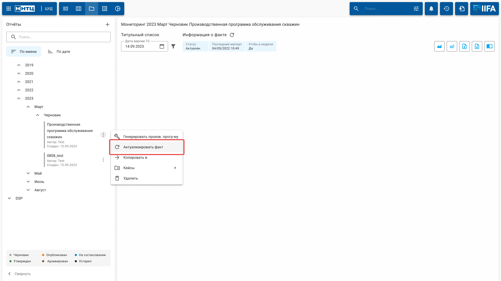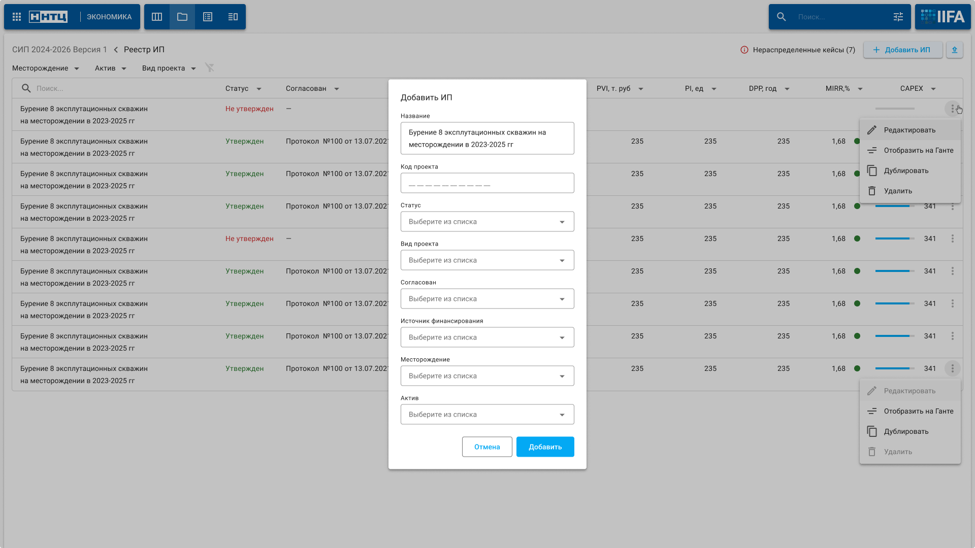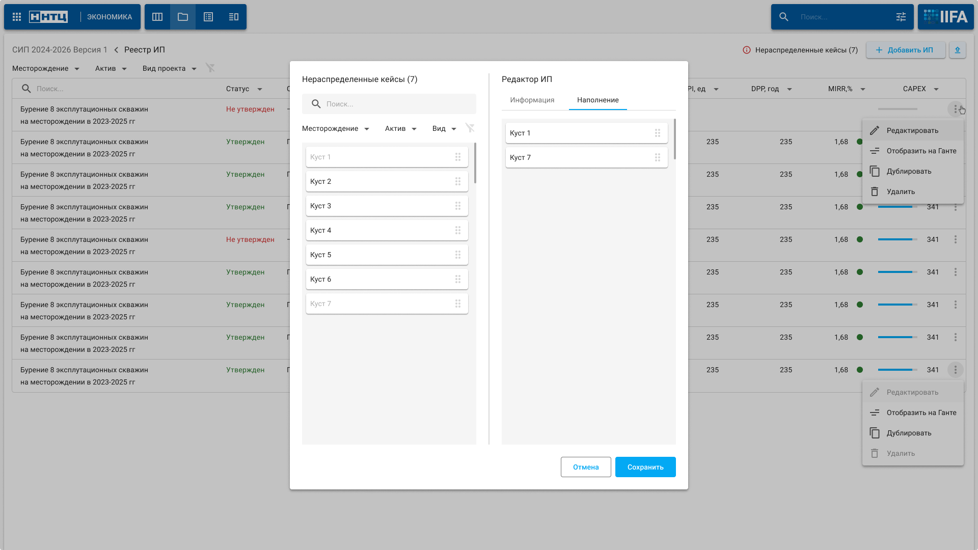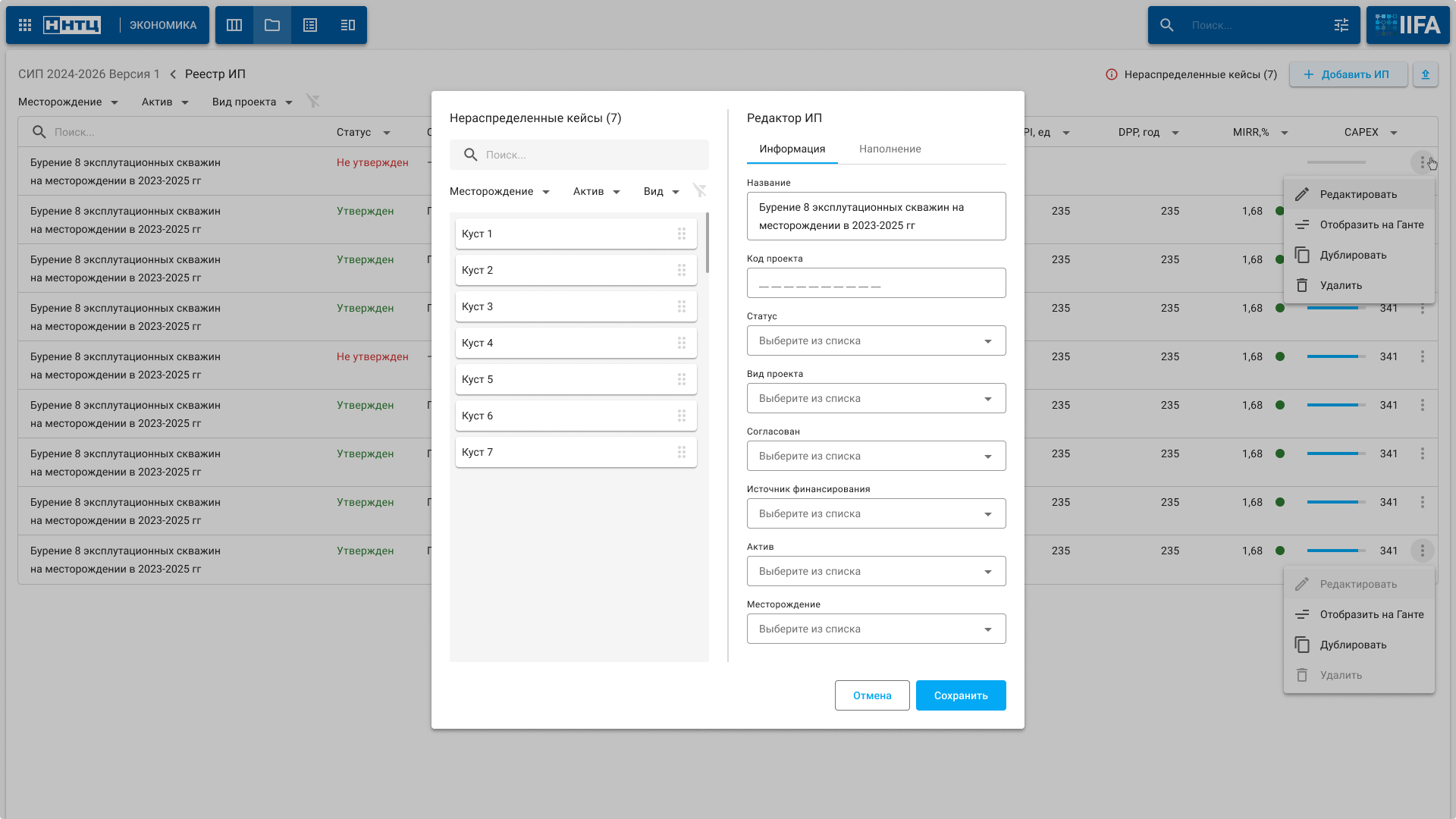 Чтобы отредактировать инвестиционный проект, пользователь должен выбрать функцию «редактировать» в реестре ИП, после чего откроется модальное окно редактирования. Атрибуты инвестиционного проекта находятся на вкладке «Информация» модального окна, а список кейсов, из которых сформирован инвестиционный проект, находится на вкладке «Наполнение». После изменения атрибутов или наполнения инвестиционного проекта пользователь нажимает кнопку «Сохранить» для сохранения изменений, либо кнопку «Отмена» для отказа от изменений. В разделе «информация» у пользователя есть возможность изменять название, статус, вид проекта, кем согласован, источник финансирования, актив, месторождение.