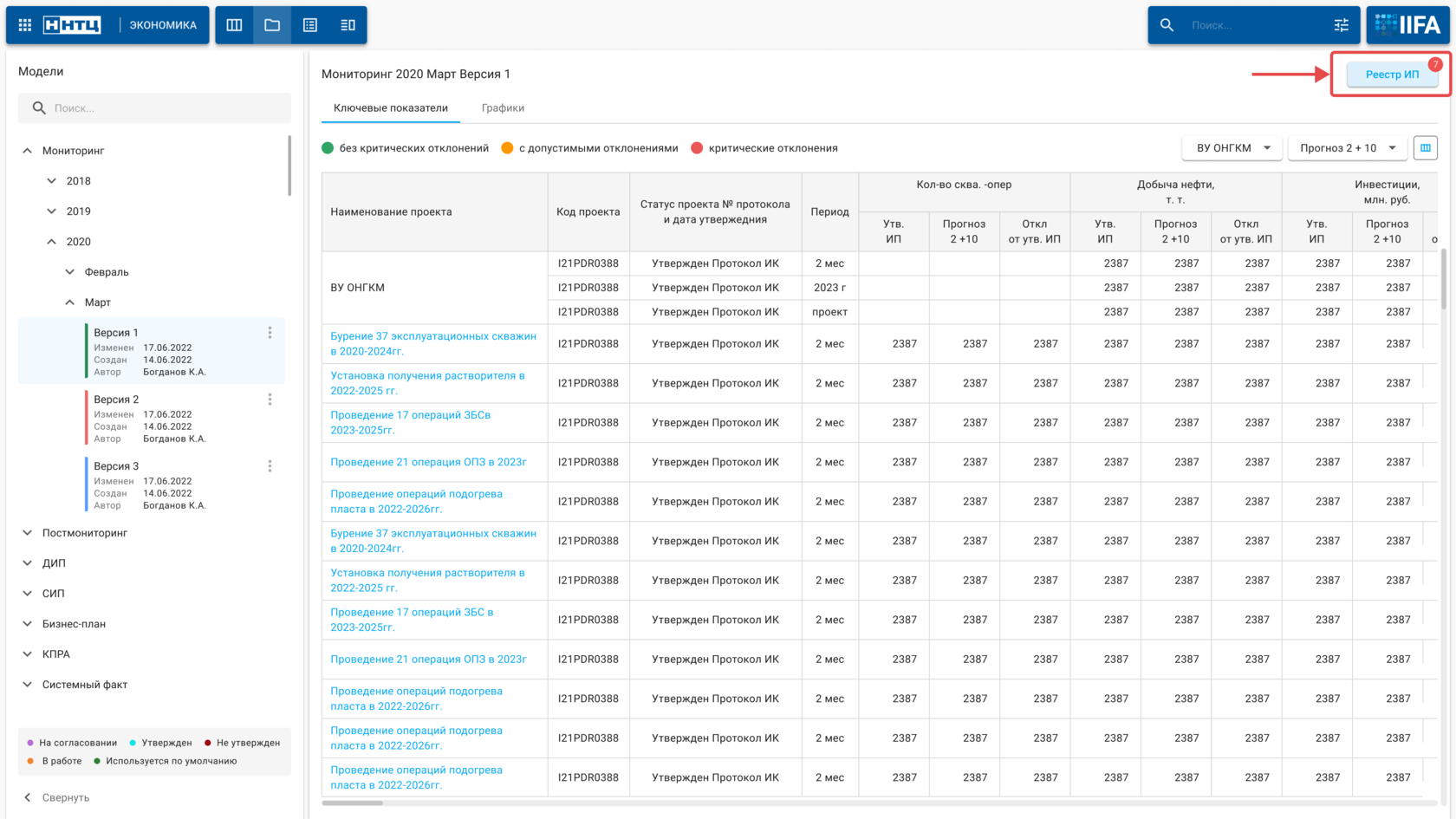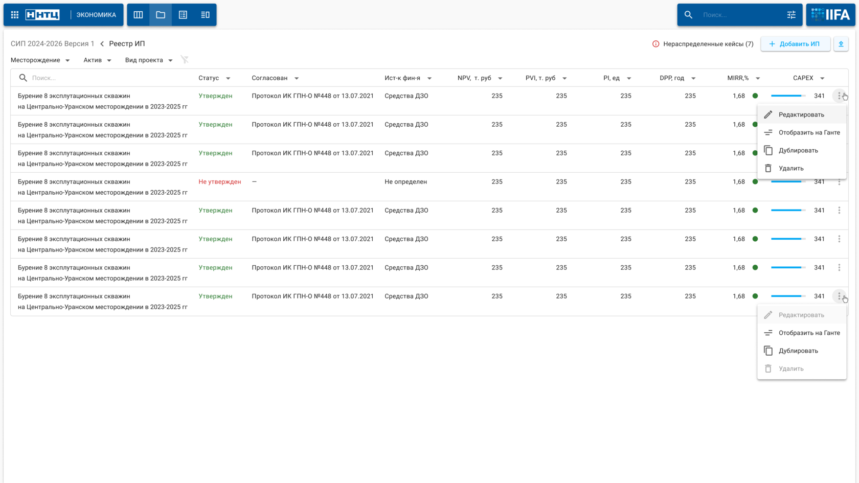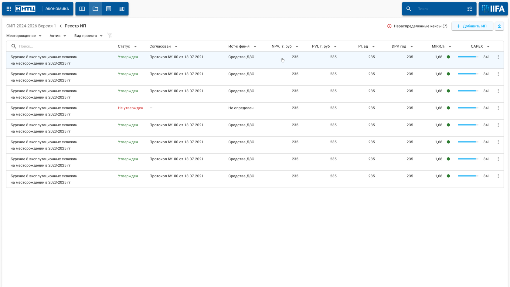 В реестре ИП хранятся инвестиционные проекты. Для каждого инвестиционного проекта указаны статус (для Мониторинга статус «утвержден»), источник финансирования, NPV, PVI, PI, DPP, MIRR, CAPEX.
