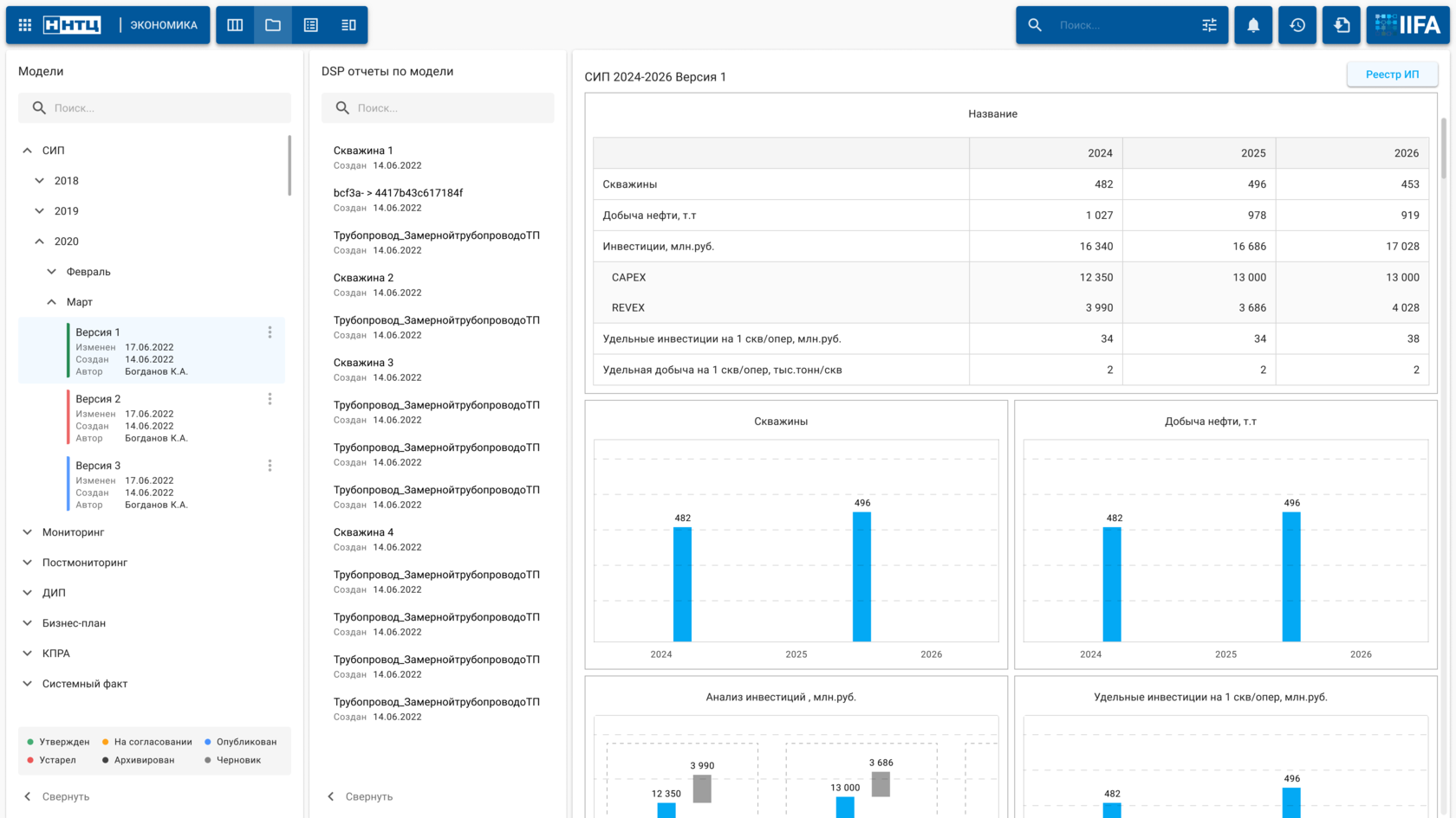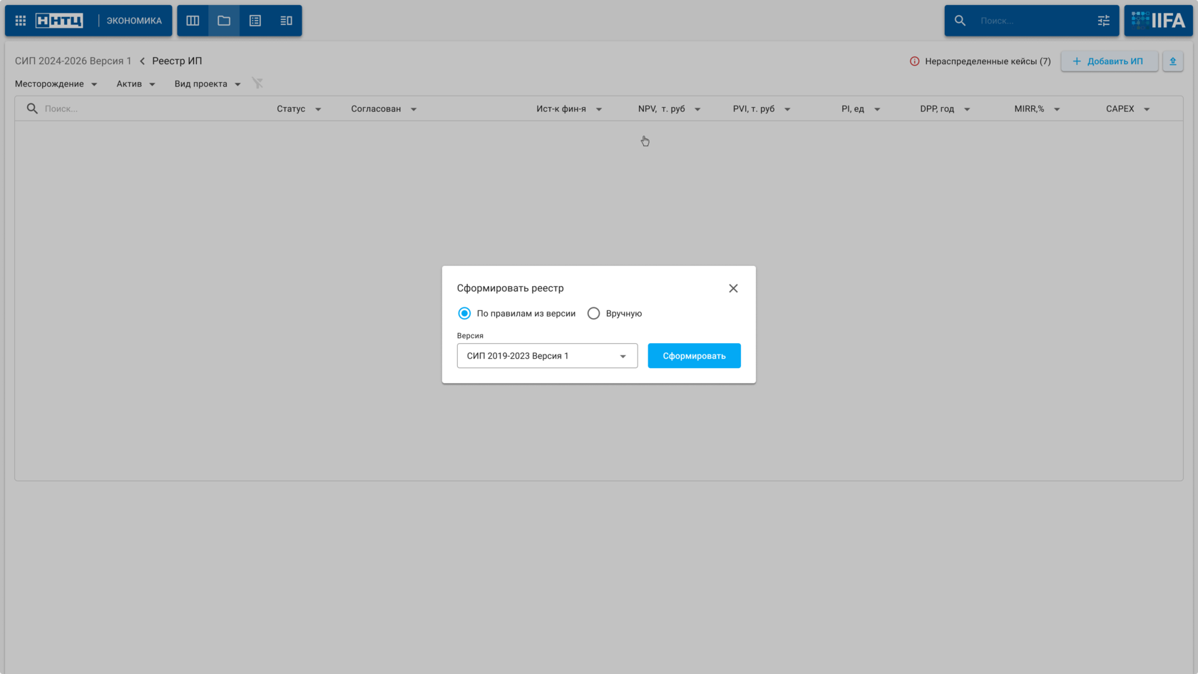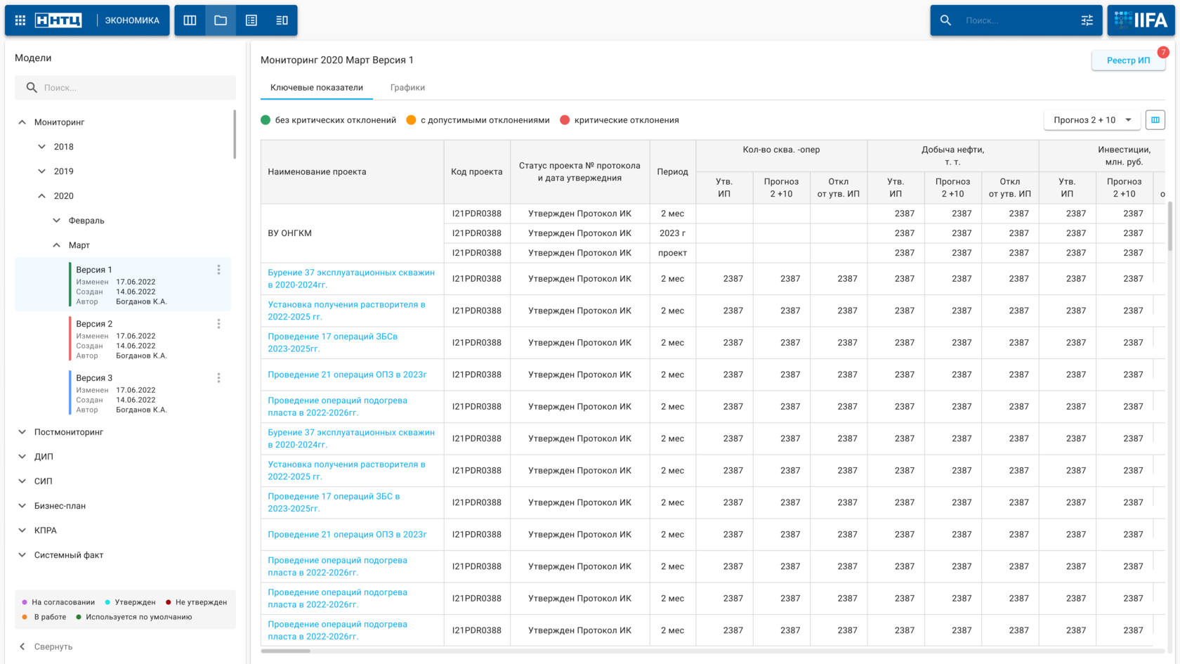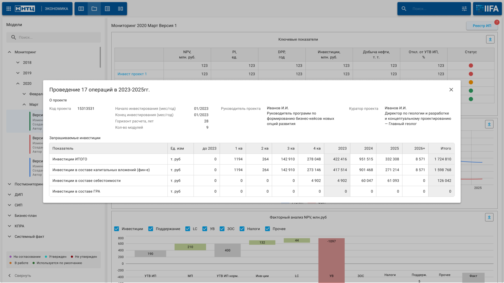 В реестре ИП хранятся инвестиционные проекты. Для каждого инвестиционного проекта указаны статус (для Мониторинга статус «утвержден»), источник финансирования, NPV, PVI, PI, DPP, MIRR, CAPEX.